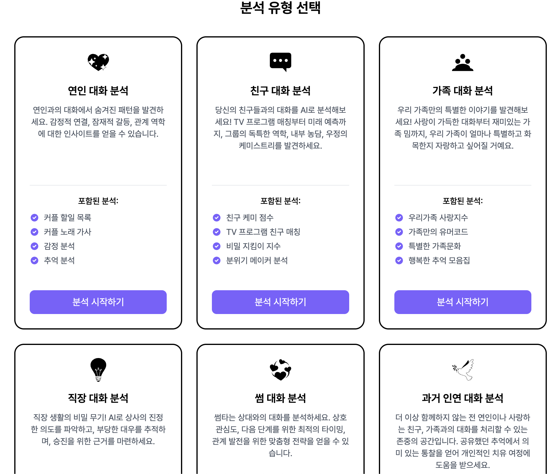 연인, 친구, 가족, 직장, 썸, 과거인연 이렇게 6개의 분석을 지원합니다.
