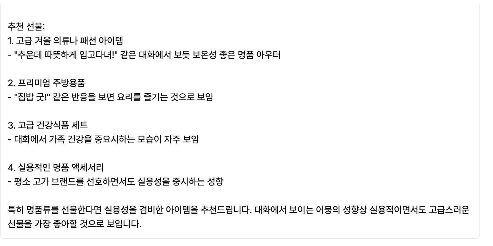 엄마가 했던 이야기들을 토대로 선물을 추천해주네요ㅋㅋ
