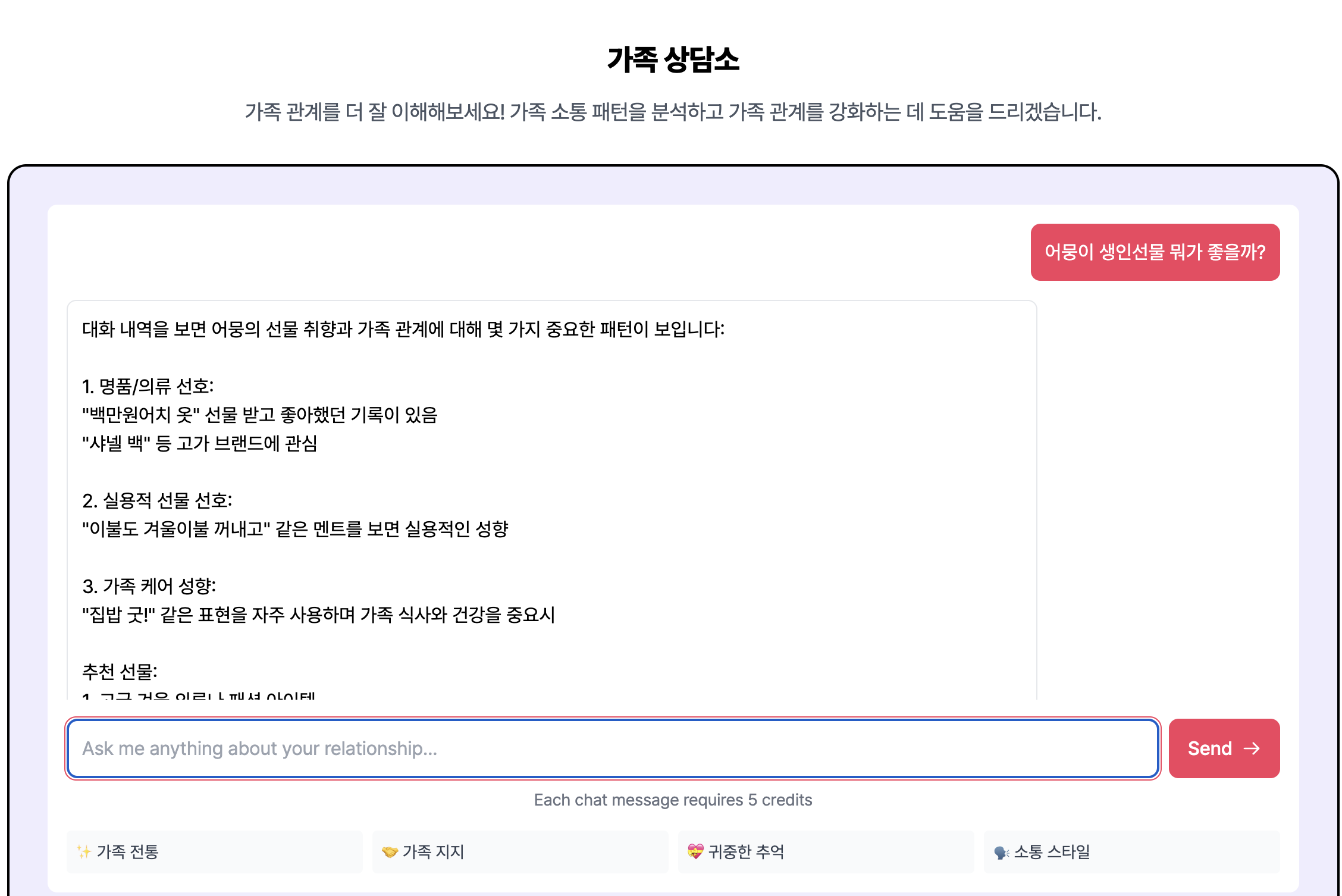 가족 행복 지수, 소중한 가족 순간들, 소통 스타일 등을 찾아준다고 합니다.