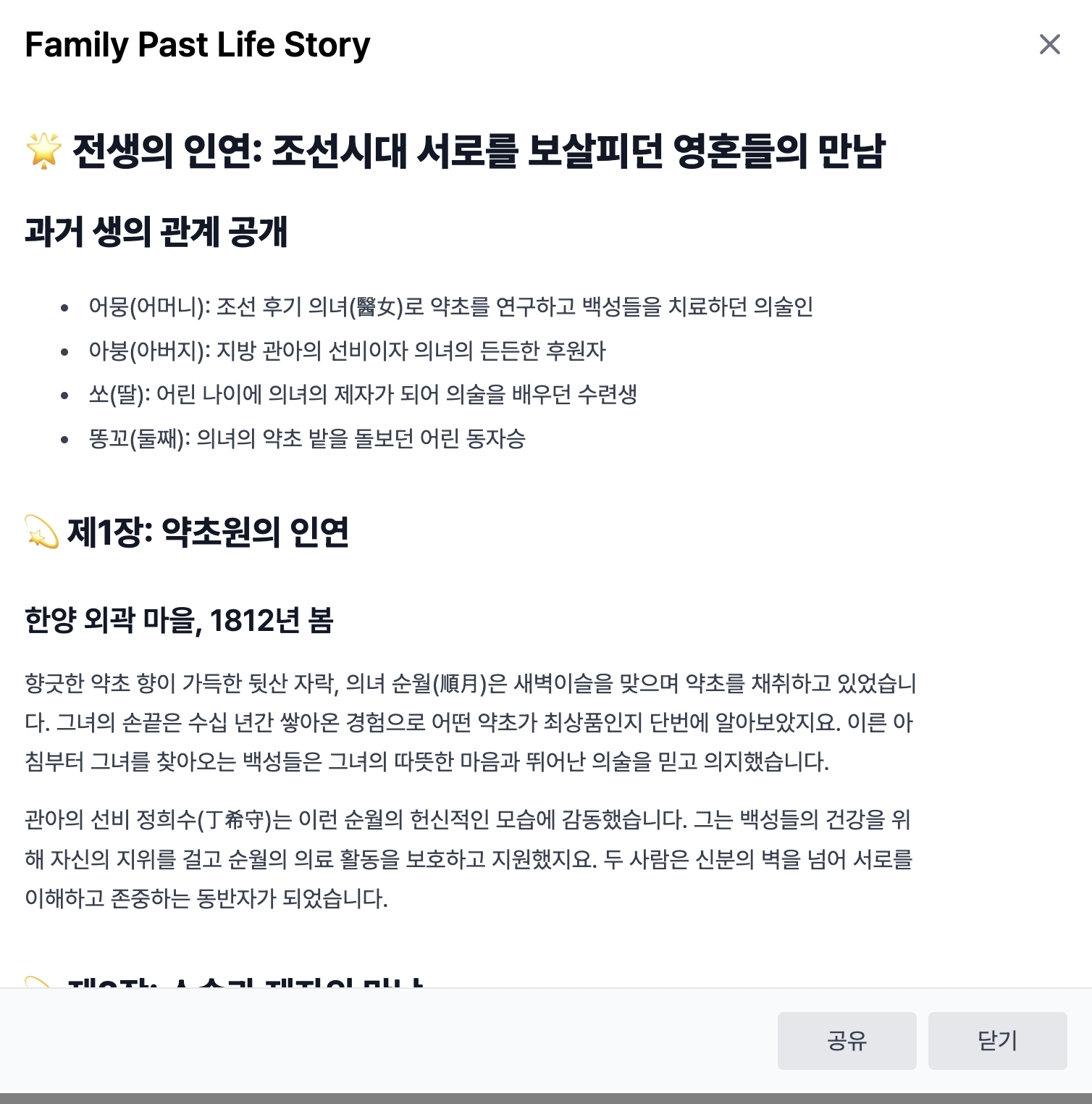전생 분석에서는 의술인과 후원자, 수련생 그리고 동자승으로 저희 가족 구성원들을 알려주고