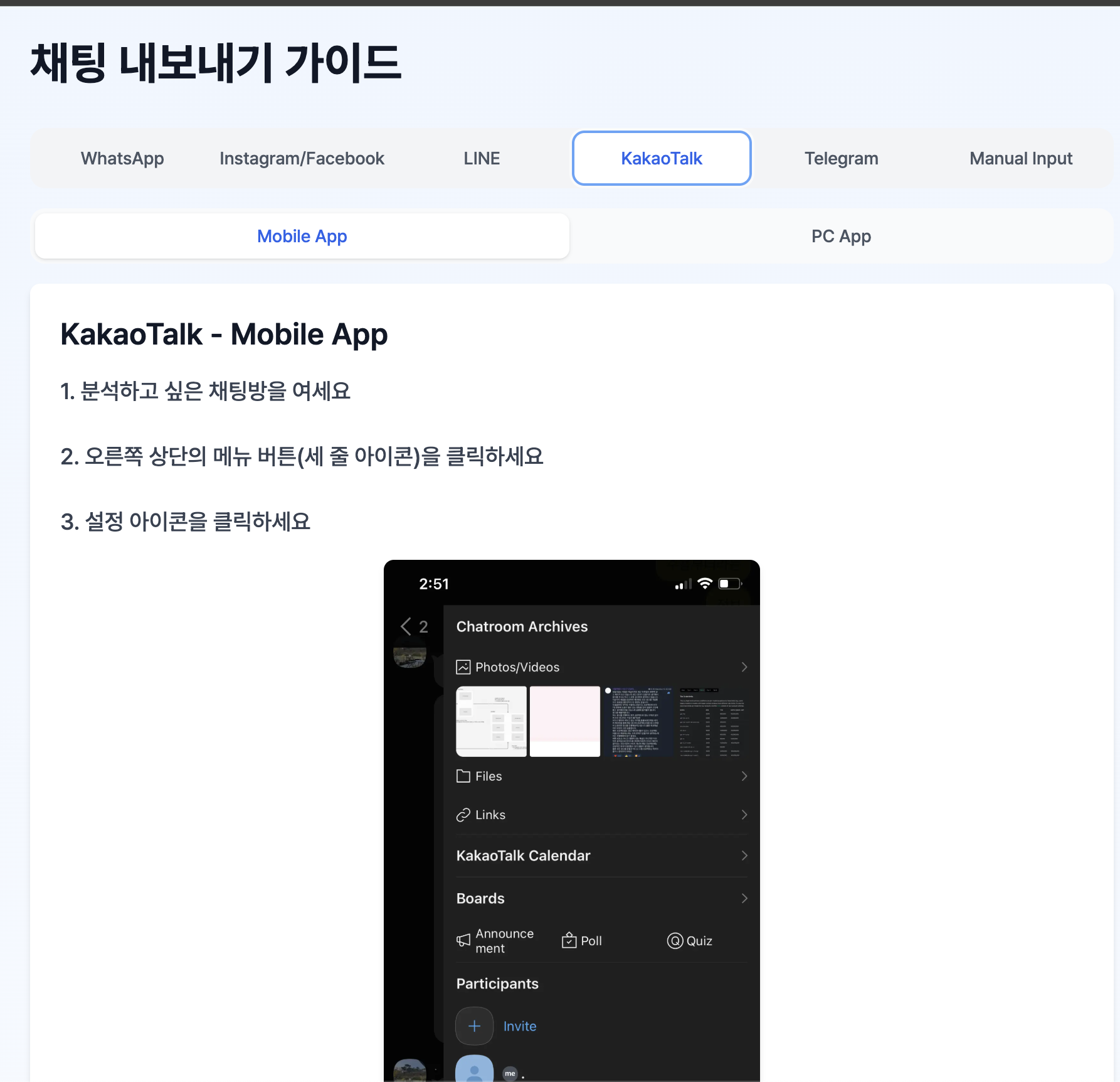 이렇게 상세하게 어떻게 채팅을 내보낼 수 있는지 알려줍니다.
